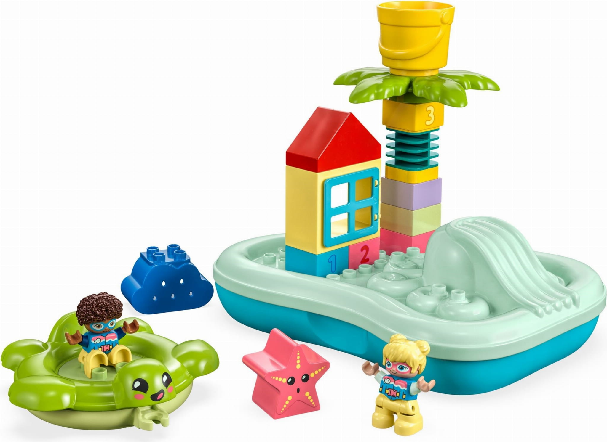 Ta zabawka edukacyjna zawiera elastyczną palmę, której wysokość dzieci mogą zwiększać, dodając do niej klocki z cyframi. Mogą też napełnić wiadro na drzewie wodą, aby ochlapać figurkę dziecka. Mogą zjechać figurką po zjeżdżalni i posadzić ją na nadmuchiwanym żółwiu. Wypełniając chmurę wodą, dzieci sprawią, że na wszystkie zabawne elementy spadnie deszcz.