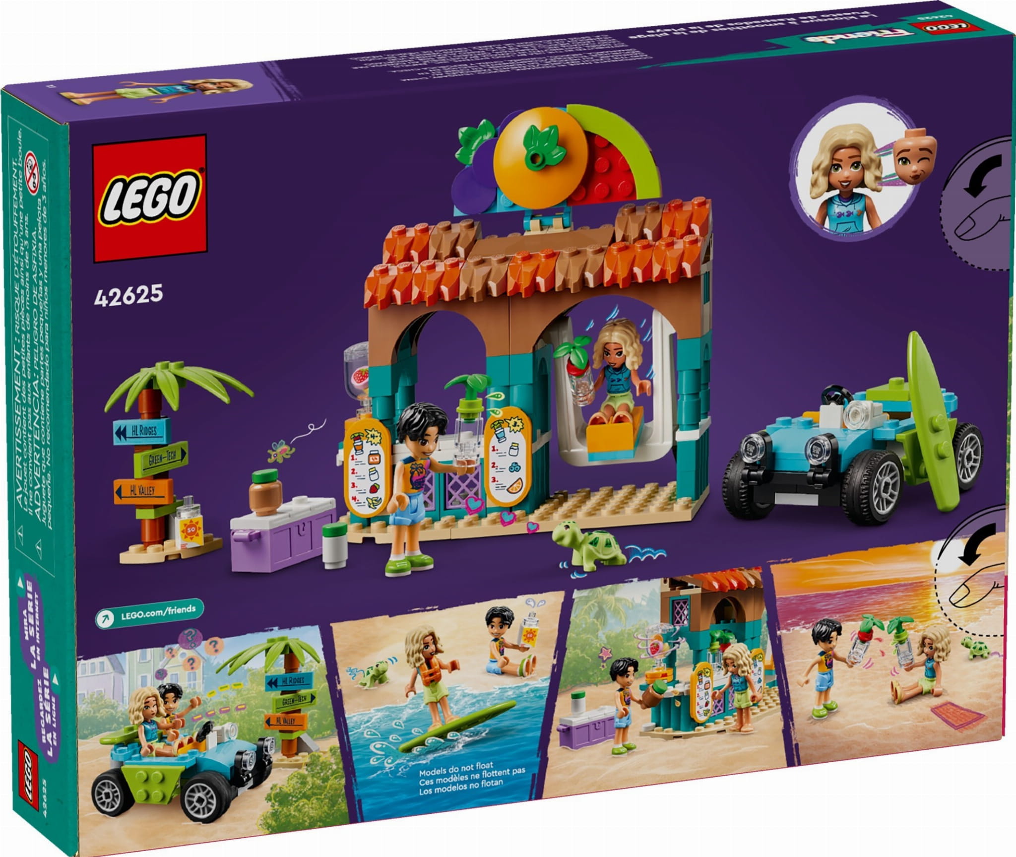 • Zestaw z budką z koktajlami — dzięki zestawowi LEGO® Friends Plażowa budka z koktajlami z dwiema minilaleczkami i figurką żółwia chłopcy i dziewczynki w wieku od sześciu lat mogą tworzyć koktajle na plaży
