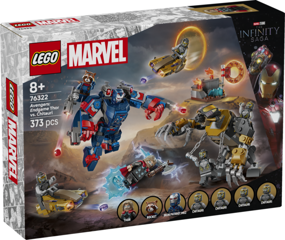 Wzorowany na kultowej scenie bitwy z Avengersami Marvela zestaw zawiera dwie duże figurki LEGO: mecha Iron Patriota, który zawiera cztery miotacze klocków, i straszliwego goryla Chitauri. Obie są ruchome, co umożliwia dynamiczną zabawę. W zestawie jest też siedem minifigurek: Iron Patriot MK2, Rocket z dużym miotaczem klocków, Thor ze Stormbreakerem i czterech Chitauri (dwóch ma złote miotacze klocków). Inne funkcje obejmują dwa skutery odrzutowe i małą przestrzeń dla Thora, w której można przechowywać zapasowe elementy do miotacza. Ten zestaw można połączyć z zestawem Avengers: Koniec gry — ostateczna bitwa (76323), co zapewnia dodatkowe możliwości zabawy. Konstruktorzy mogą również powiększać i obracać modele w 3D za pomocą fajnej, intuicyjnej aplikacji LEGO Builder. Zestaw zawiera 373 elementy.